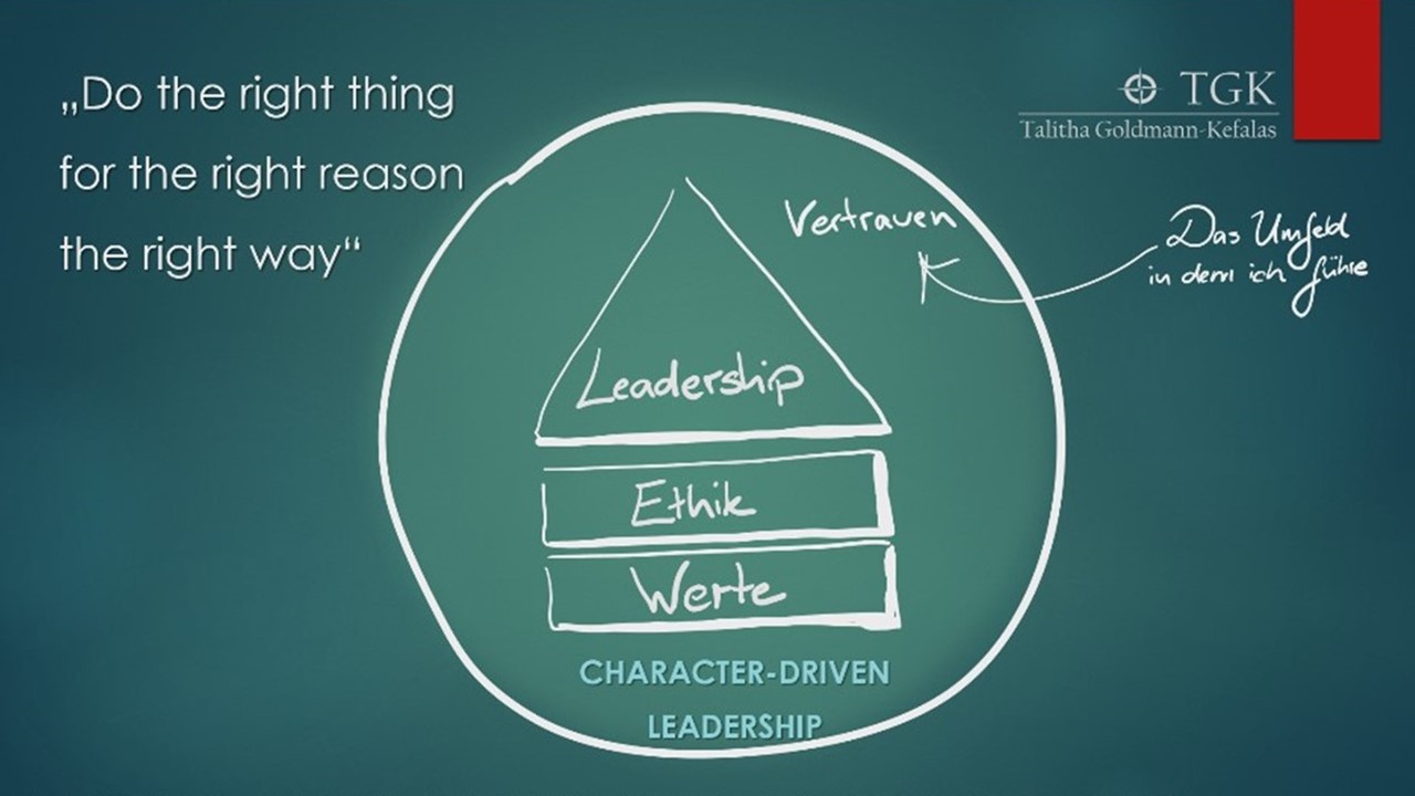 Character-Driven Leadership (McCain Institute for International Leadership) fußt auf dem Verständnis, dass ich selbst geprägt bin durch andere und mit meinem einzigartigen Charakter (von χαρακτήρ =„Prägung“,„Prägestempel“) mein Umfeld und andere Menschen nachhaltig prägen kann. Das allein jedoch kann auch äußerst negative Formen und Entwicklungen annehmen (s. Führungspersönlichkeit A. Hitler, dessen Fähigkeit, andere mitzureißen, zu begeistern und zu bewegen, wohl kaum einer infrage stellt, wohl aber seine Führung).