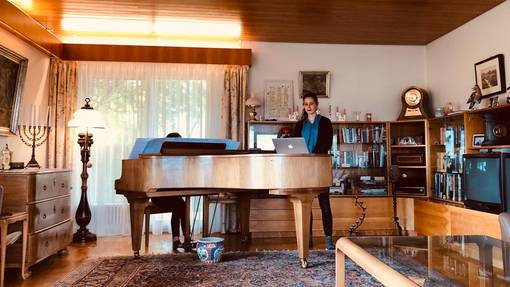 Aber ich kann noch unterrichten! Unter ganz anderen Voraussetzungen natürlich, aber ich bin glücklich, dass ich dank der technischen Möglichkeiten den Kontakt zu meinen Schülerinnen und Schülern halten und sie weiter beim Klavierspielenlernen begleiten kann: Ich stelle mein Handy mit einem Stativ an mein Klavier, sodass meine Schülerinnen und Schüler mich und die Tastatur sehen können. Es ist ganz wichtig, dass wir uns gegenseitig und vor allem auch unsere Gesichter sehen! Voraussetzung ist natürlich, dass beide über eine stabile Internetverbindung verfügen, denn sonst wären Bild und Ton asynchron. Was aber fehlt, ist die Berührung: Im Klavierunterricht ist es selbstverständlich, dass ich zum Beispiel die Handhaltung korrigiere – es fühlt sich fremd an, dass diese persönliche Ebene nun fehlt. Ich sehe auch nicht mehr, wie die Schülerinnen und Schüler das Pedal bedienen. Vor einigen Tagen mussten ich und eine Schülerin sehr lachen, denn ihr Pedal quietschte laut – das stellte sich plötzlich als Vorteil heraus, weil ich so mitbekam, wann sie es benutzte. So liegen in dieser herausfordernden Situation immer auch amüsante Momente, die Nähe bringen und uns gemeinsam lachen lassen.
